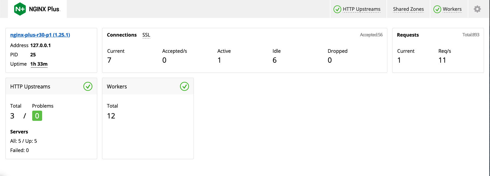 kubectl port-forward <nginx-plus-pod> 8765:8765 -n <nginx-plus-pod-namespace>Afterwards, use a browser to access http://127.0.0.1:8765/dashboard.html to view the dashboard.