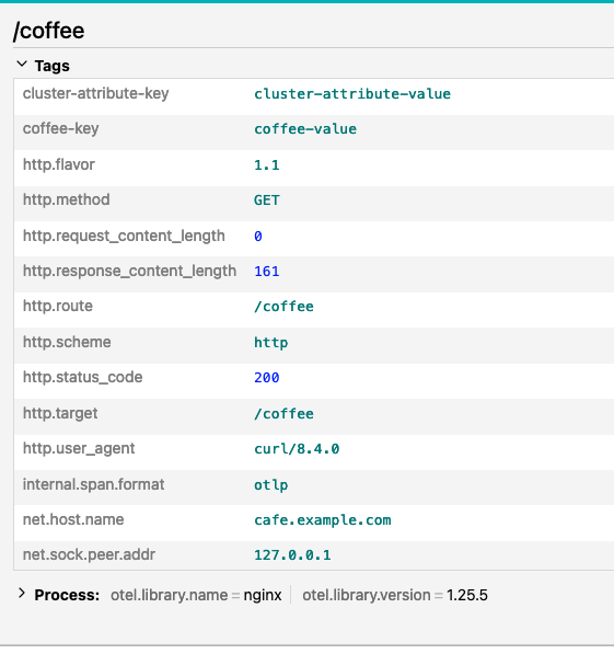 The trace includes the attribute from the global NginxProxy resource as well as the attribute from the ObservabilityPolicy.