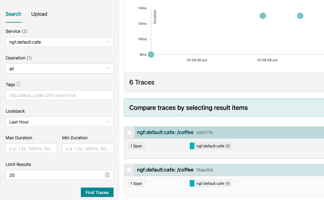 curl --resolve cafe.example.com:$GW_PORT:$GW_IP http://cafe.example.com:$GW_PORT/coffeeOnce complete, refresh the Jaeger dashboard. You should see a service entry called ngf:default:cafe, and a few traces. The default service name is ngf:<gateway-namespace>:<gateway-name>.