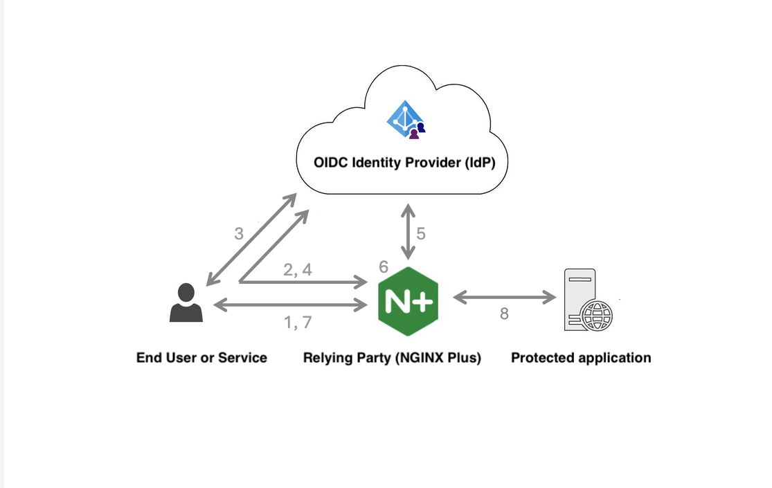 - NGINX Plus as an OIDC client application that verifies user identity (Relying Party).