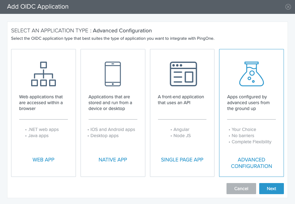 The Add OIDC Application window pops up. Click the ADVANCED CONFIGURATION box, and then the Next button.