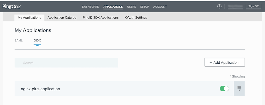 You are returned to the My Applications window, which now includes a row for nginx-plus-application . Click the toggle switch at the right end of the row to the “on” position, as shown in the screenshot. Then click the “expand” icon at the end of the row, to display the application’s details.