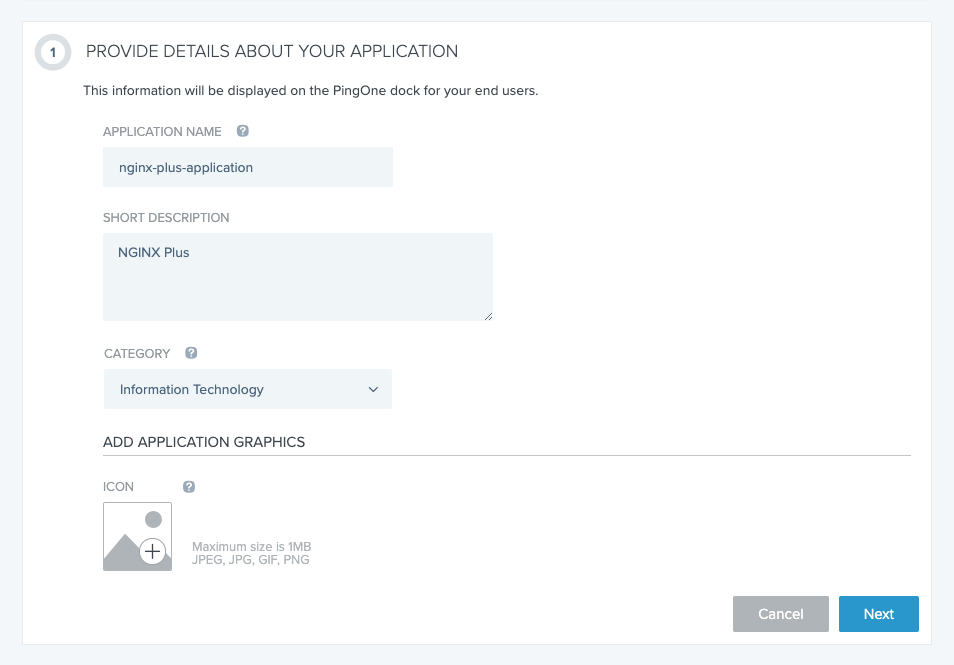 In section 1 (PROVIDE DETAILS ABOUT YOUR APPLICATION), type a name in the APPLICATION NAME field and a short description in the SHORT DESCRIPTION field. Here, we’re using nginx-plus-application and NGINX Plus . Choose a value from the CATEGORY drop‑down menu; here we’re using Information Technology . You can also add an icon if you wish. Click the Next button.