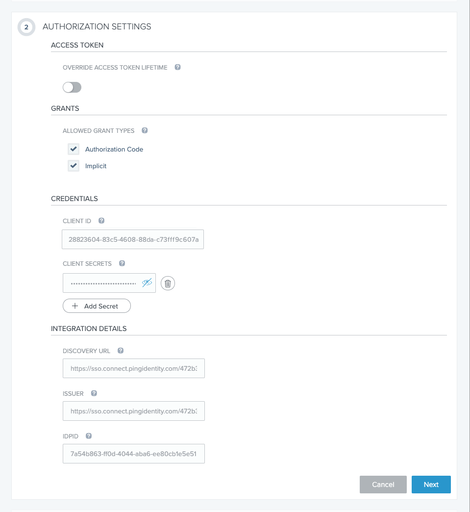 set $oidc_authz_endpoint– Value ofauthorization_endpointfrom Step 3 (in this guide,https://sso.connect.pingidentity.com/sso/as/authorization.oauth2)set $oidc_token_endpoint– Value oftoken_endpointfrom Step 3 (in this guide,https://sso.connect.pingidentity.com/sso/as/token.oauth2)set $oidc_client– Value in the CLIENT ID field in Step 12 of Configuring PingFederate or PingOne for Enterprise (in this guide,28823604-83c5-4608-88da-c73fff9c607a)set $oidc_client_secret– Value in the CLIENT SECRETS field in Step 12 of Configuring PingFederate or PingOne for Enterprise (in this guide,7GMKILBofxb...)set $oidc_hmac_key– A unique, long, and secure phrase