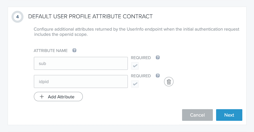 In section 4 (DEFAULT USER PROFILE ATTRIBUTE CONTRACT), optionally add attributes to the required sub and idpid attributes, by clicking the + Add Attribute button. We’re not adding any in this example. When finished, click the Next button.