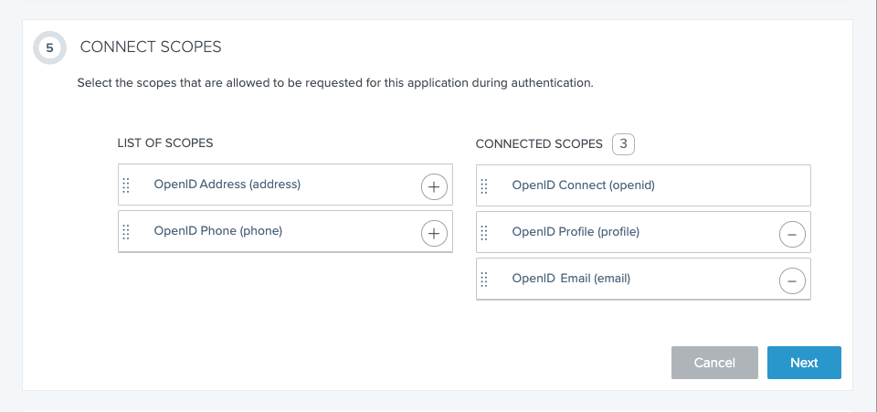 In section 5 (CONNECT SCOPES), click the circled plus-sign on the OpenID Profile (profile) and OpenID Profile Email (email) scopes in the LIST OF SCOPES column. They are moved to the CONNECTED SCOPES column, as shown in the screenshot. Click the Next button.