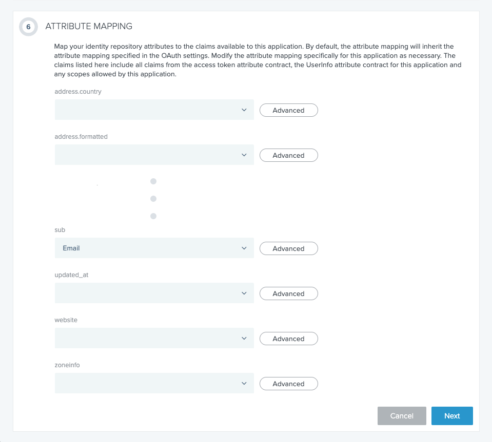 In section 6 (ATTRIBUTE MAPPING), map attributes from your identity repository to the claims available to the application. The one attribute you must map is sub, and here we have selected the value Email from the drop‑down menu (the screenshot is abridged for brevity).