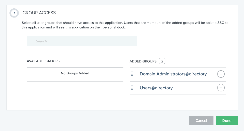 In section 7 (GROUP ACCESS), select the groups that will have access to the application, by clicking the circled plus-sign on the corresponding boxes in the AVAILABLE GROUPS column. The boxes move to the ADDED GROUPS column. As shown in the screenshot we have selected the two default groups, Domain Administrators@directory and Users@directory.